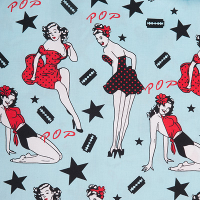 Este vestido lolita pin up en color azul está estampado con chicas pin up, estrellas, cuchillas, …